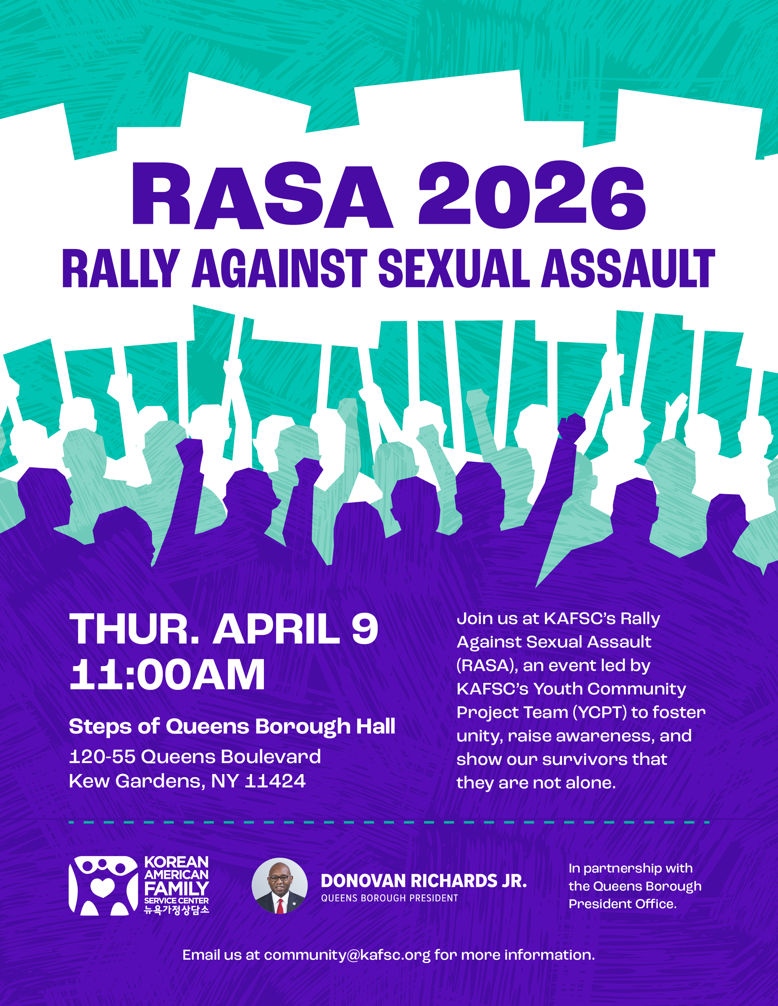 Korean American Family Service Center (KAFSC) invites community members, advocates, and allies to join us for RASA 2026: Rally Against Sexual Assault, a powerful gathering dedicated to raising awareness, standing in solidarity with survivors, and calling for a violence-free future.